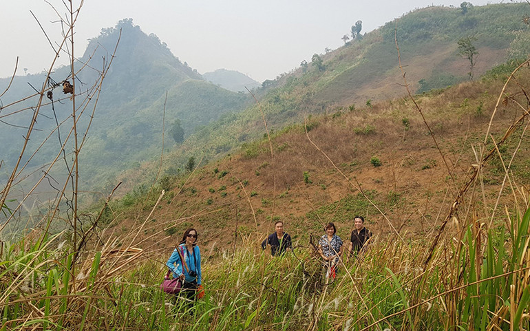 Gia đình Thượng tướng Phạm Ngọc Mậu chụp ảnh lưu niệm trên đường lên đỉnh Pha Sông (đỉnh cao nhất bên trái), nơi đặt căn cứ của Ban Chỉ huy kéo pháo Mặt trận Điện Biên Phủ năm xưa. (Ảnh do gia đình Thượng tướng Phạm Ngọc Mậu cung cấp)