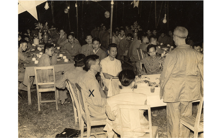 Trong buổi liên hoan mừng Chiến thắng Điện Biên Phủ, đồng chí Phạm Ngọc Mậu (đánh dấu X) vinh dự được ngồi chung bàn với Chủ tịch Hồ Chí Minh, Đại tướng Võ Nguyên Giáp, Thứ trưởng Quốc phòng Hoàng Anh, cùng các cố vấn Trung Quốc. (Ảnh do gia đình Thượng tướng Phạm Ngọc Mậu cung cấp)