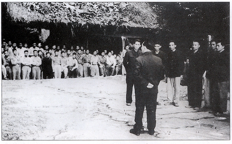Nhận mệnh lệnh tác chiến trên sa bàn Chiến dịch Điện Biên Phủ từ Đại tướng Võ Nguyên Giáp. Trong ảnh: Hàng đầu từ bên phải sang là các đồng chí: Lê Liêm, Đặng Kim Giang, Hoàng Văn Thái, Phạm Ngọc Mậu, Lê Trọng Tấn, Vương Thừa Vũ. (Ảnh do gia đình Thượng tướng Phạm Ngọc Mậu cung cấp)