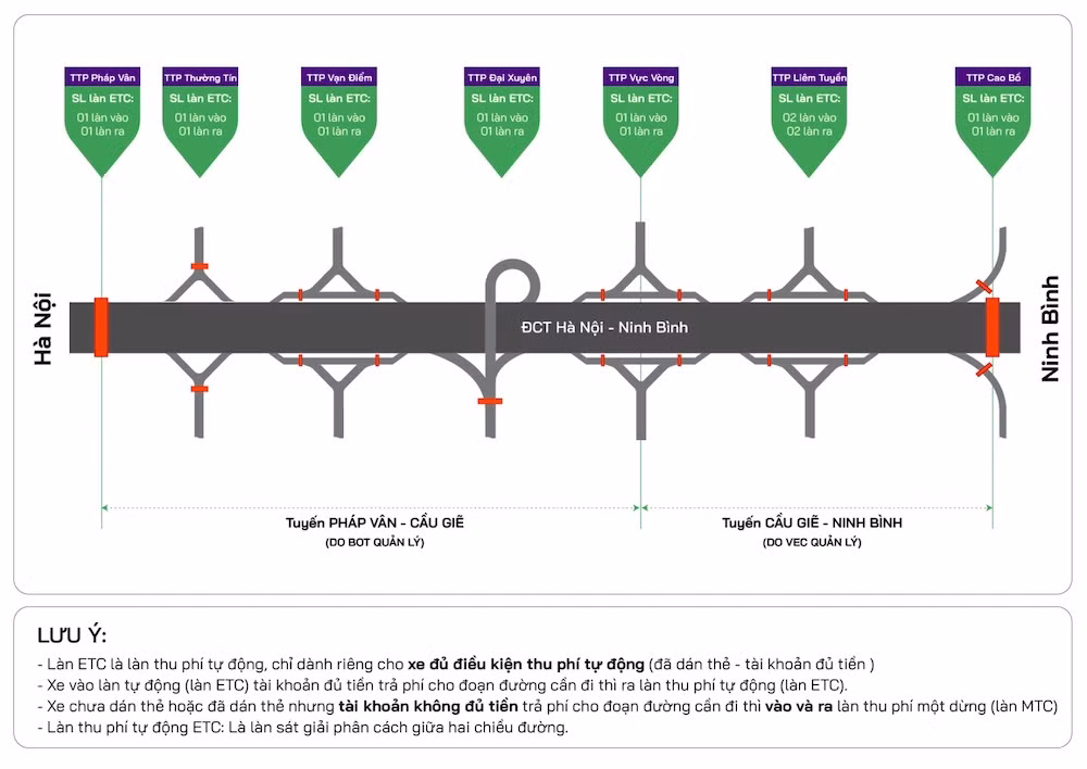 Theo đó, tuyến cao tốc Pháp Vân – Cầu Giẽ - Ninh Bình bắt đầu triển khai dịch vụ thu phí tự động không dừng ETC từ 15 giờ ngày 10-6-2020 với sơ đồ như sau: