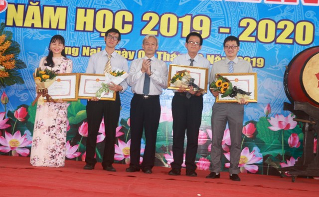 Đồng chí Nguyễn Phú Cường, Ủy viên T.Ư Đảng, Bí thư Tỉnh ủy, Chủ tịch HĐND tỉnh Đồng Nai trao bằng khen của UBND tỉnh cho bốn giáo viên Trường THPT chuyên Lương Thế Vinh có thành tích suất sắc. (Ảnh: THIÊN VƯƠNG)
