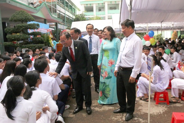 Ủy viên T.Ư Đảng, Bí thư Tỉnh ủy Bình Dương Trần Văn Nam động viên học sinh Trường THPT Tân Phước Khánh (thị xã Tân Uyên) nhân ngày khai giảng (Ảnh: :TRỊNH BÌNH).