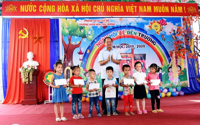Chủ tịch UBND tỉnh Bắc Cạn Lý Thái Hải trao học bổng tặng học sinh nghèo Trường Mầm non xã Chu Hương, Ba Bể (Ảnh: TUẤN SƠN).