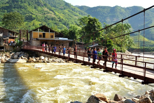 Sau mấy ngày mưa tầm tã, sáng nay, ở xã Bản Hồ, huyện Sa Pa (Lào Cai) trời quang mây tạnh, nắng bừng lên trong sân trường tiểu học đón các em học sinh vào năm học mới. Cách đó không xa, cây cầu treo mới cũng vừa được hoàn thành thay thế cầu treo cũ bị lũ ống cuốn trôi hồi cuối tháng 6, nâng bước các em học sinh người dân tộc Tày, Dao, Mông đến lớp dự khai giảng năm học mới 2019-2020.