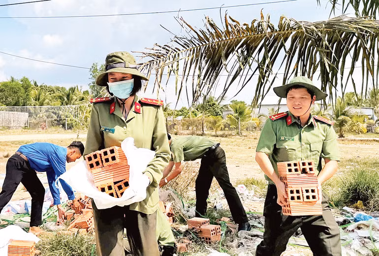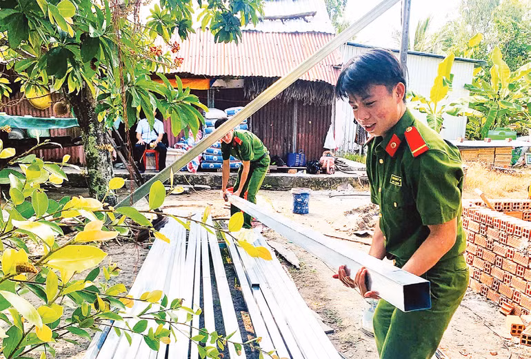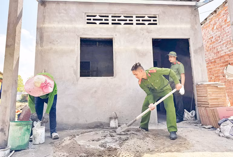 Hàng trăm đoàn viên, thanh niên tại các cơ sở đoàn trong lực lượng công an Kiên Giang đã trực tiếp hỗ trợ ngày công lao động, “3 cùng” (cùng ăn, cùng ở, cùng làm) với nhân dân từ thứ sáu đến chủ nhật hằng tuần. Các bạn trẻ tham gia nhiều phần việc như đắp nền nhà, chuyển gạch, trộn bê-tông, dựng nhà, lợp mái tôn, lát nền gạch… giúp người dân tiết kiệm chi phí xây dựng, nâng cao chất lượng công trình. Mỗi đoàn viên, thanh niên dành ra ít nhất ba ngày công lao động.