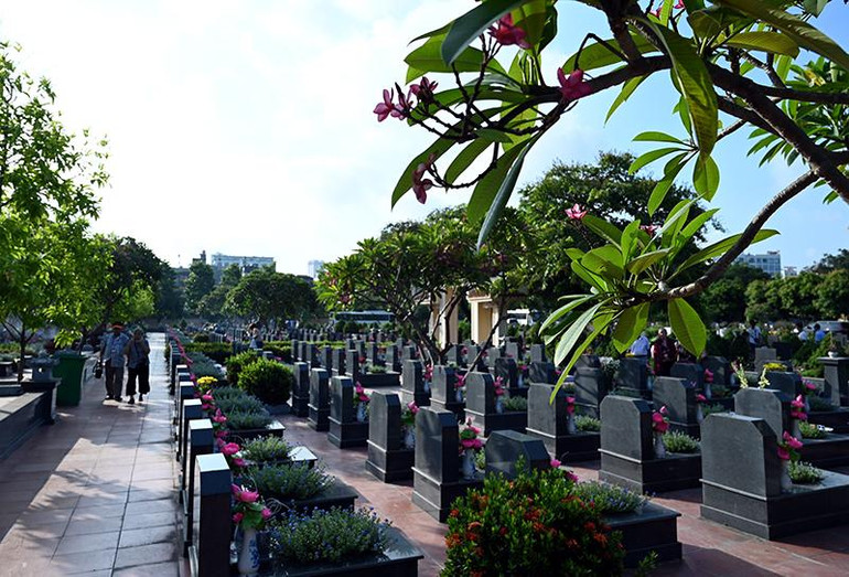 | Thân nhân một gia đình liệt sĩ chuẩn bị hương hoa dâng lên phần mộ tại nghĩa trang Mai Dịch. |