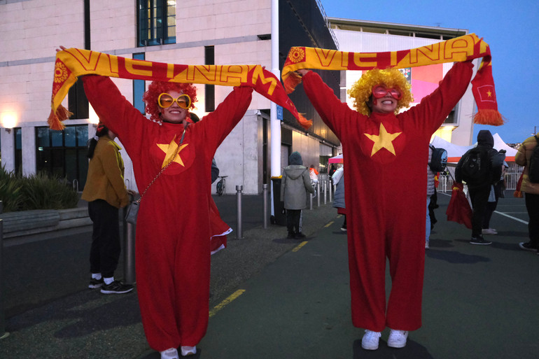 | Cổ động viên Hà Lan và Việt Nam giao lưu. (Ảnh: ĐỖ ĐẠT) |