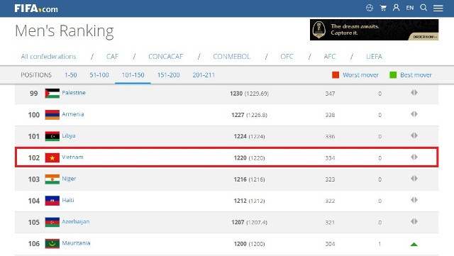 Tuyển Việt Nam tăng gần 900 điểm trên BXH mới nhất của FIFA để vững chắc vị trí dẫn đầu Đông Nam Á. (Ảnh chụp màn hình FIFA)