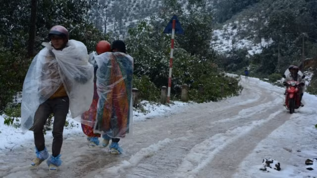 Tuyết phủ kín tuyến Quốc lộ 32 đoạn qua đèo Khau Phạ (Yên Bái) khiến toàn bộ các phương tiện giao thông qua khu vực này phải nằm chờ. Người dân đi đường phải cuốn chăn và mặc áo mưa. Nhiều diện tích lúa, rau mầu được che phủ ni-lông cũng bị tuyết phủ kín.