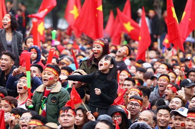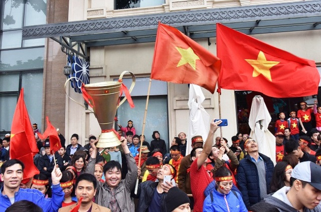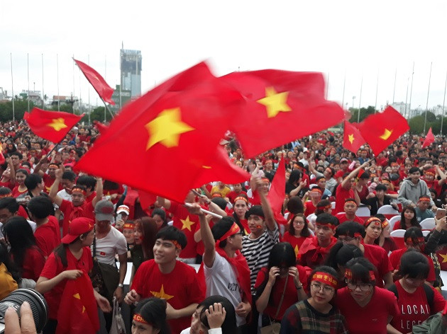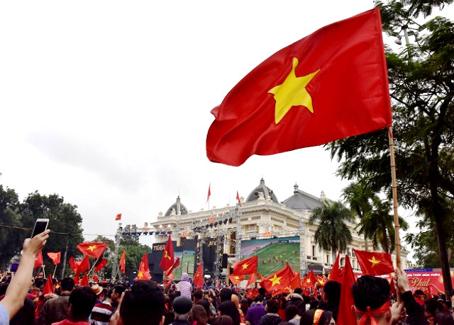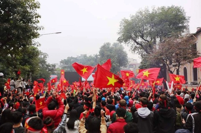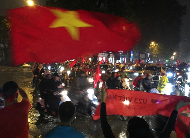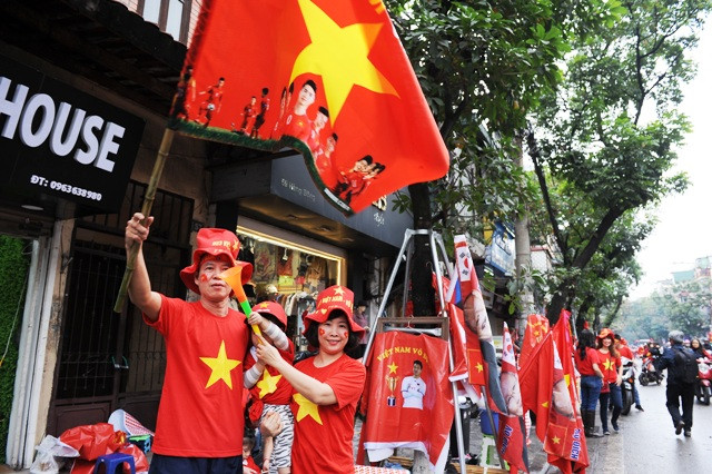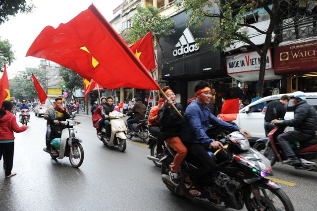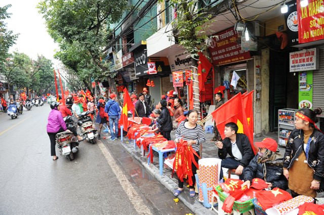 Cờ đỏ sao vàng tung bay trên tay các cổ động viên xuất hiện trên khắp các tuyến phố (Ảnh: Duy Linh)