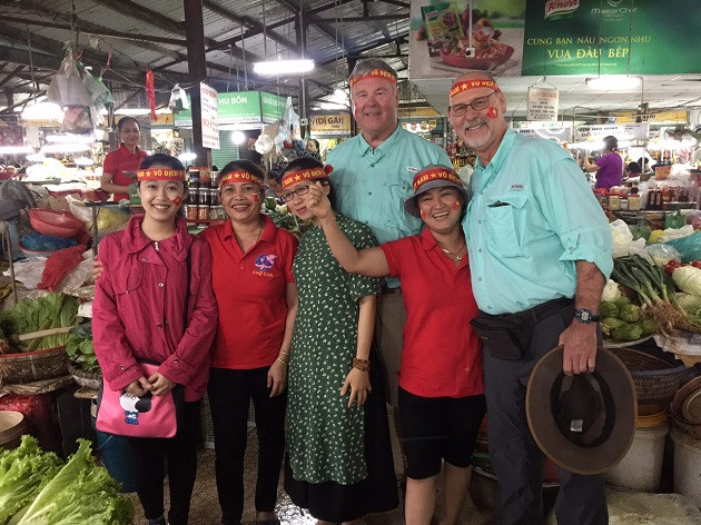 Tại chợ Cồn, hàng trăm tiểu thương đều mặc áo đỏ, dán cờ Tổ quốc để ủng hộ tinh thần cho các tuyển thủ Việt Nam. Không khí cổ vũ nóng lên với rất nhiều du khách quốc tế cùng hoà chung với tinh thần Việt Nam. (Ảnh: Anh Đào)