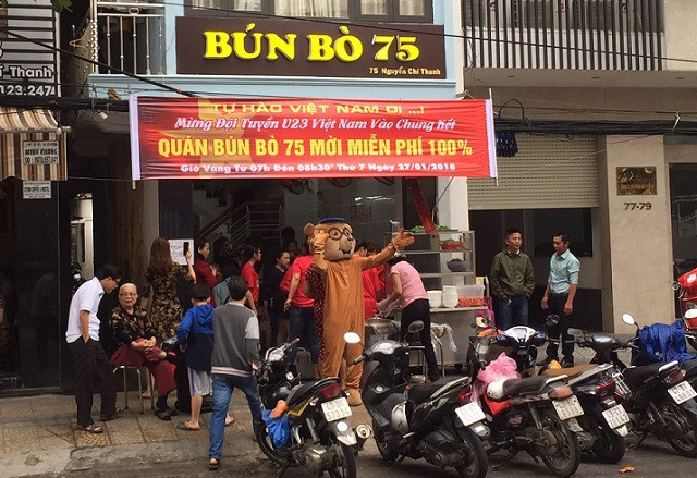Anh Khánh, chủ quán Bún bò 75 Nguyễn Chí Thanh chia sẻ "Chúng tôi rất tự hào về đội tuyển Việt Nam. Chúng tôi muốn gửi lời chúc các tuyển thủ vững vàng thi đấu và chiến thắng. Như một cách thể hiện tấm lòng, gia đình chúng tôi "tiếp lửa" từ xa với việc mời người dân dùng bún miễn phí sáng nay". (Ảnh: Anh Đào)