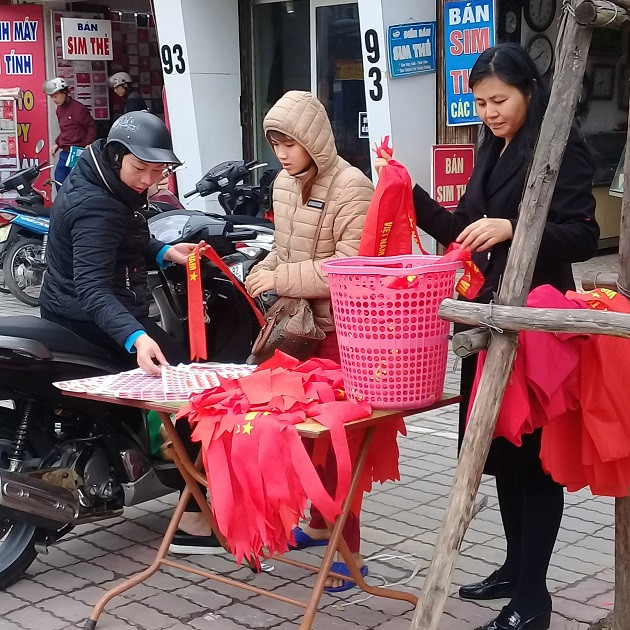 Băng rôn, cờ đỏ được bày bán đầy ngoài đường. (Ảnh: Mai Tú)