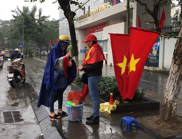 Người hâm mộ đội mưa mua cờ, băng rôn cổ vũ đội tuyển trên phố Nguyễn Khánh Toàn, Cầu Giấy (Ảnh: Duy Linh)