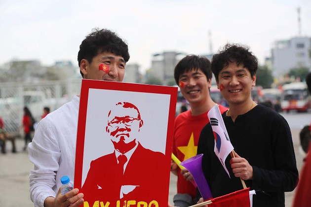 Du khách Hàn Quốc đang làm việc tại Hà Nội cũng đến sân Mỹ Đình để cổ vũ cho đội tuyển. (Ảnh: Nam Nguyễn)