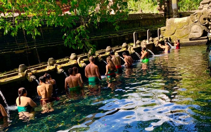 Đền Pura Tirta Empul với nghi lễ tắm nước thánh độc đáo, thu hút nhiều du khách nước ngoài.
