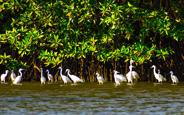 Sáng sớm, ông Huỳnh Trung Tấn và một cán bộ của Ban quản lý khu bảo tồn Cồn Chim đã chờ sẵn ở bến đò Phước Sơn. Chiếc xuồng máy chạy dầu ì ì rời bến, xuôi dọc đầm. Một bên là rừng sú vẹt, một bên là bãi nuôi trồng thủy sản của ngư dân xóm đảo. Dọc đường đi, thỉnh thoảng bắt gặp những ngư dân khai thác hải sản bằng lưới hay câu từ biển trở về sau một đêm mưu sinh. Ðể phục vụ công tác nghiên cứu và bảo tồn, khu sinh thái ngập mặn được chia ra nhiều khu vực chức năng như: khu nuôi sinh thái kết hợp trồng rừng ngập mặn, khu bảo tồn cỏ biển, khu sân chim, khu nuôi động vật thân mềm… Trong đó, riêng hệ thực vật đã có khoảng 25 loài, nằm trong các dải rừng ngập mặn nguyên sinh và tái sinh. Những cây sú, vẹt, đước, bần… cùng với các loài cỏ biển, rong biển ở đây đang ngày càng hồi phục và phát triển. Hệ động vật cũng rất phong phú, với khoảng 64 loài phù du, 76 loài cá, hàng trăm loài chim, trong đó 23 loài thuộc nhóm chim nước và chim di cư, 10 loài chim rừng. Rừng ngập mặn ở đây được các nhà khoa học xác định đã có hàng trăm năm tạo thành một hệ sinh thái thực vật đa dạng, môi trường sống trong lành cho các loài thủy sản như tôm, cua, cá trú ẩn, sinh sôi, nảy nở.