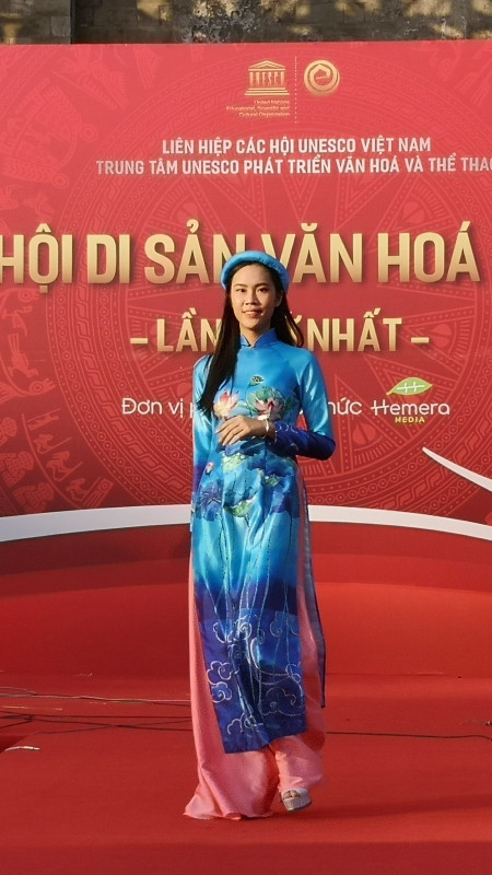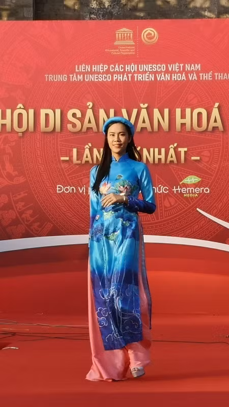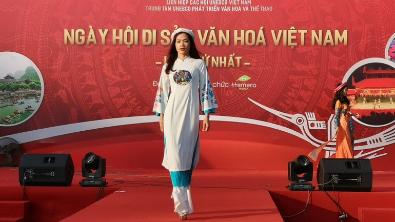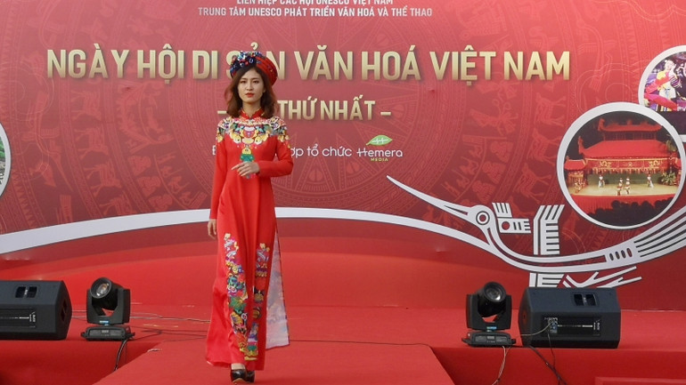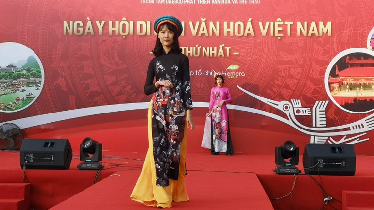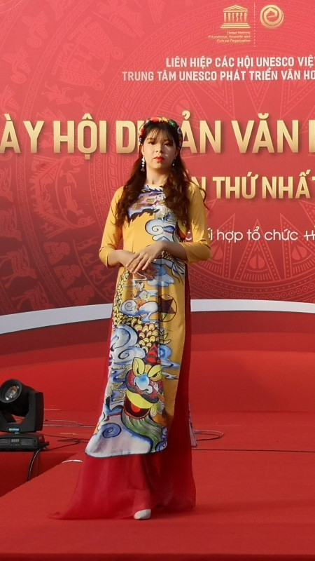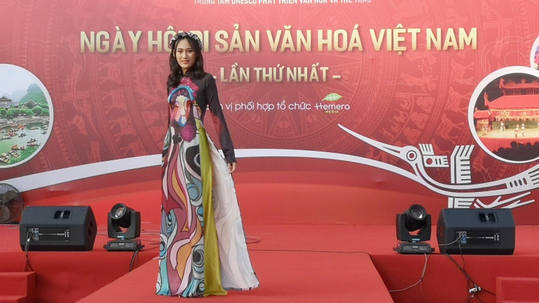 Những họa tiết nổi bật đậm chất từng vùng miền của Tổ quốc được thể hiện sinh động trên tà áo dài của NTK Hà Anh.