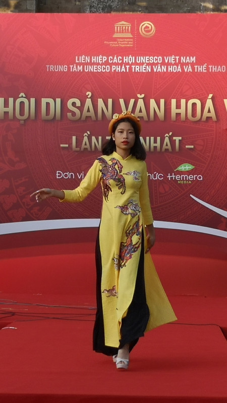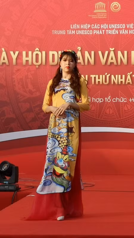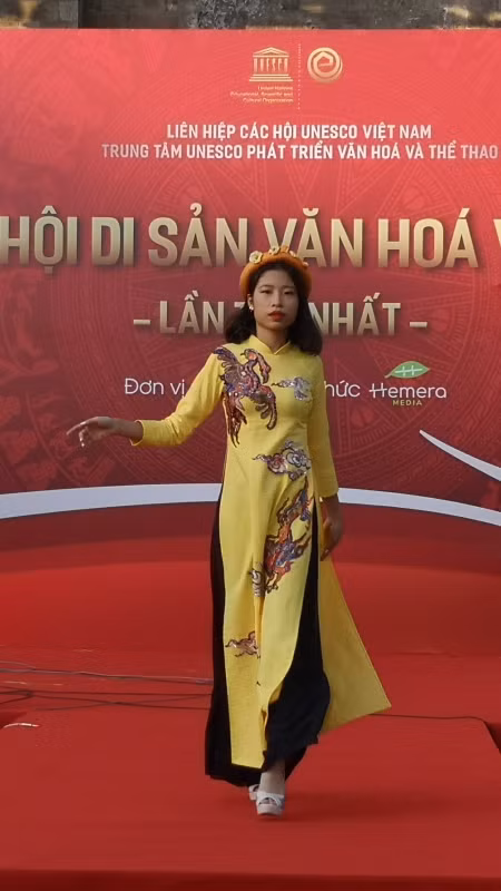 Hình ảnh Long - Phụng thể hiện trên tà áo dàng sắc vàng sống động.