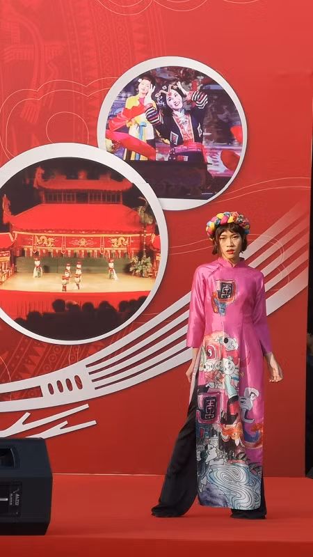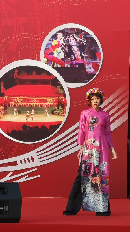 Hình ảnh dải đất chữ S được in trên nền màu đỏ rực rỡ của tà áo dài.
