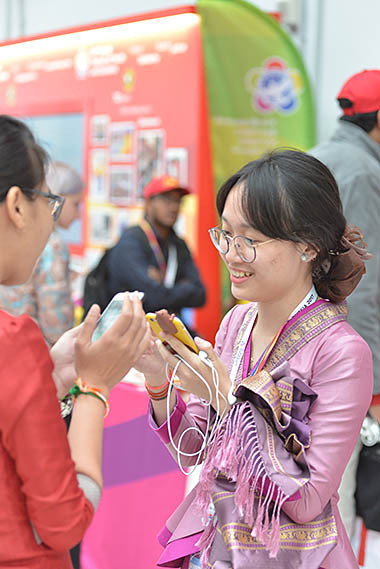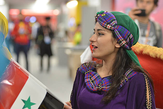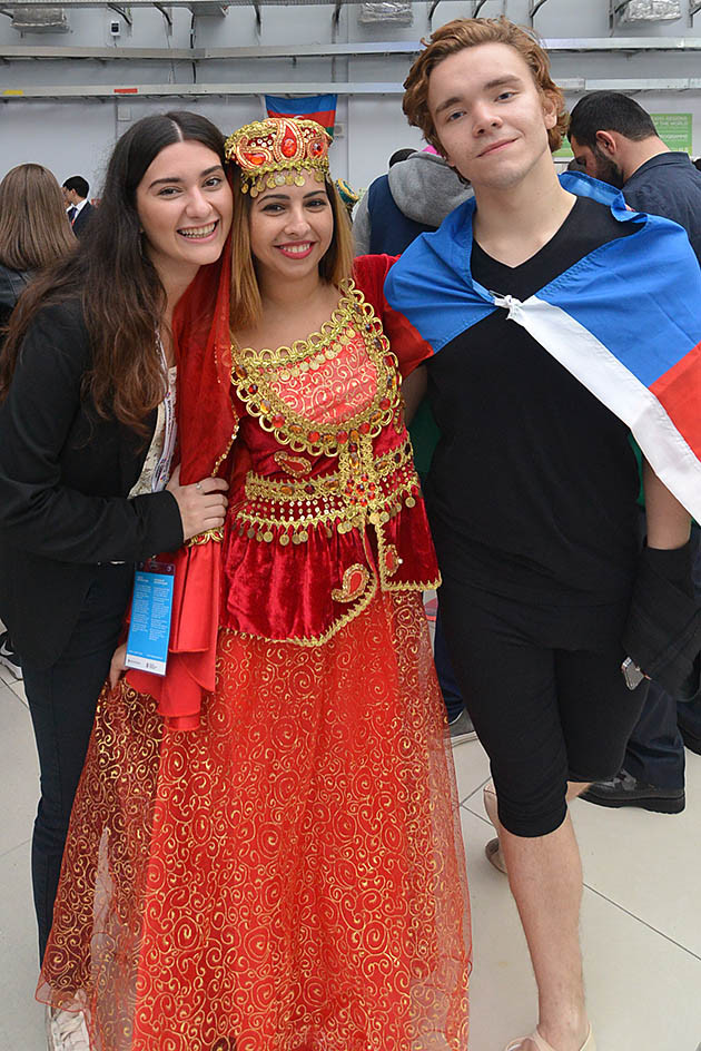 Các đại biểu Azerbaijan chuẩn bị cho tiết mục múa tập thể. Tiết mục này sau đó thu hút hàng trăm đại biểu các nước tham gia ngay tại khu triển lãm các gian hàng.