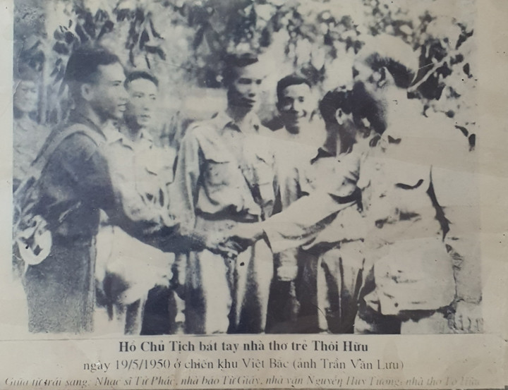 Nhà thơ, nhà báo Thôi Hữu vinh dự được bắt tay Bác Hồ ở chiến khu Việt Bắc, ngày 19-5-1950, nhân dịp Bác Hồ gặp các nhà báo. (Ảnh tư liệu của Trần Văn Lưu)