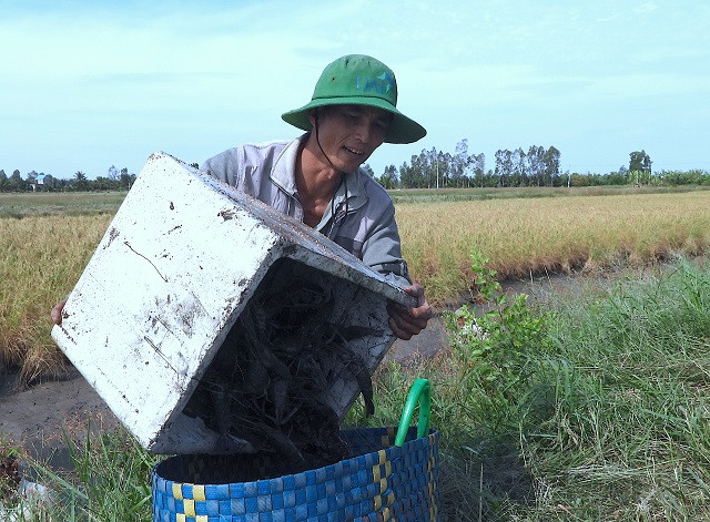 Gia đình bà Nguyễn Thị Cực thả nuôi 6,2 triệu tiền giống, sau gần 6 tháng thu được hơn 180 kg tôm, tổng thu hơn 21 triệu đồng.