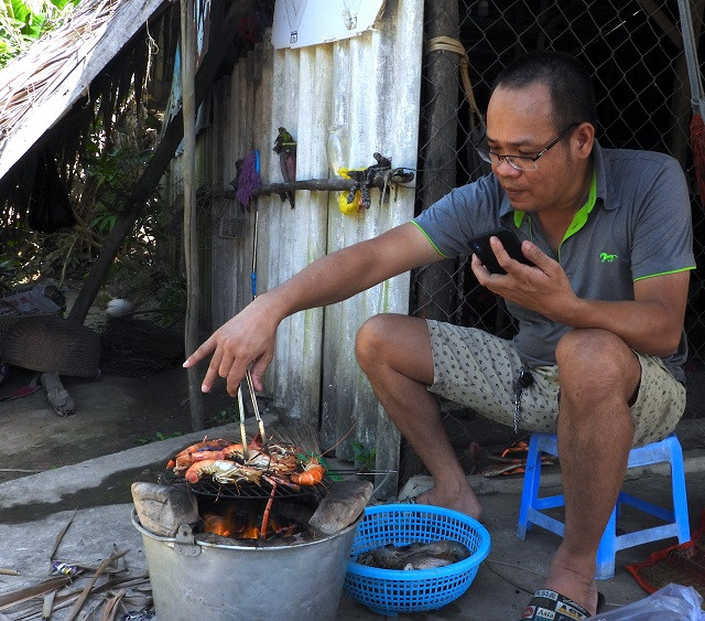 Nhà nông Cà Mau “tự thưởng” món tôm càng xanh sau gần nửa ngày thu hoạch mệt nhọc.