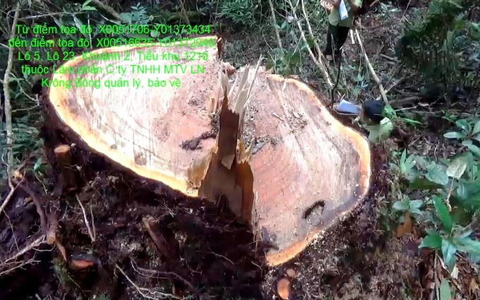 Qua kiểm đếm của lực lượng chức năng, số gỗ còn tại hiện trường khoảng 20 m3. Các vết cắt bằng cưa xăng, mùn cưa tại hiện trường còn rất mới, nhiều gốc cây mới được đốn hạ, mủ còn chảy ra tại các vết cắt, cành lá còn xanh tươi. Vị trí các cây gỗ bị khai thác được xác định bằng máy GPS 78s nằm ở lô 5, lô 23, khoảnh 2; lô 8, lô 21 khoảnh 3 Tiểu khu 1219, thuộc lâm phần do Công ty lâm nghiệp Krông Bông quản lý. Dọc từ khoảnh 2 đến khoảnh 3, lâm tặc đã chặt hạ nhiều cây rừng mở một con đường mòn và nhiều đường xương cá, vận chuyển lâm sản ra khỏi rừng bằng gùi, trâu kéo… Thế nhưng, chủ rừng cũng như các ngành chức năng ở địa phương không hề hay biết, khi vụ việc được phát hiện thì đã có 48 cây gỗ pơ-mu hàng trăm năm tuổi đã bị “xẻ thịt”.