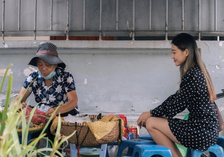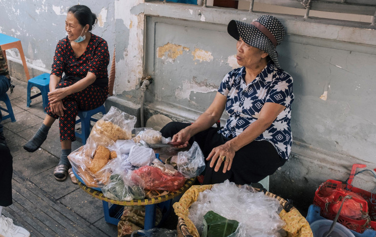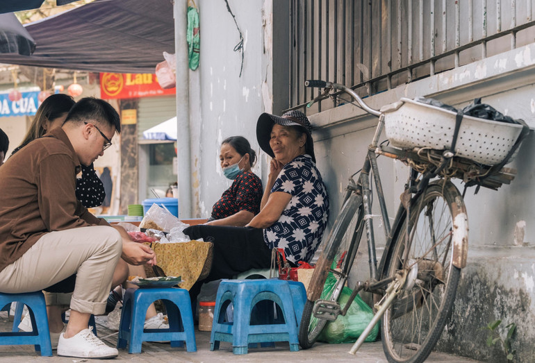 Tồn tại ngót nghét 34 năm, hàng cơm nắm bánh dày lúc nào cũng tấp nập người mua dù nơi đây chỉ là gian hàng rất khiêm tốn với hai chiếc thúng, vài cái mẹt con con cùng dăm chiếc ghế nhựa nhỏ.
