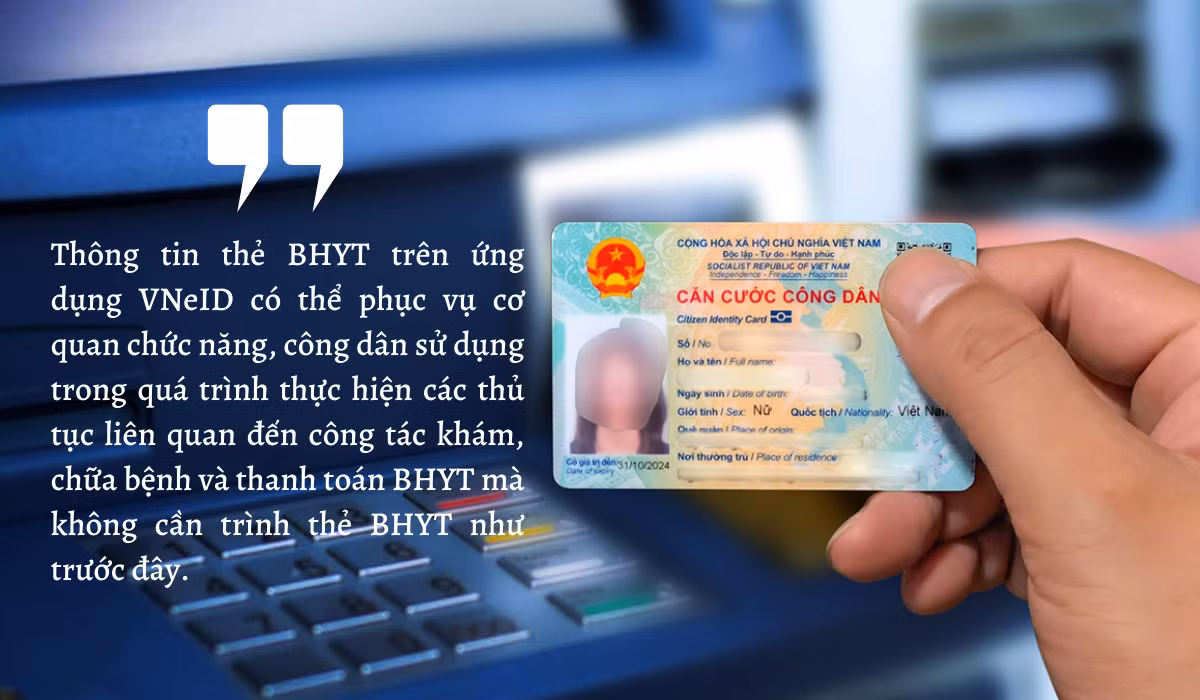 Các thông tin về Bảo hiểm y tế trên VNeID được xác thực và truy xuất từ Cơ sở dữ liệu Bảo hiểm y tế. Vì vậy, thông tin thẻ Bảo hiểm y tế trên ứng dụng VNeID có thể phục vụ cơ quan chức năng, công dân sử dụng trong quá trình thực hiện các thủ tục liên quan đến công tác khám, chữa bệnh và thanh toán Bảo hiểm y tế mà không cần trình thẻ Bảo hiểm y tế như trước đây.