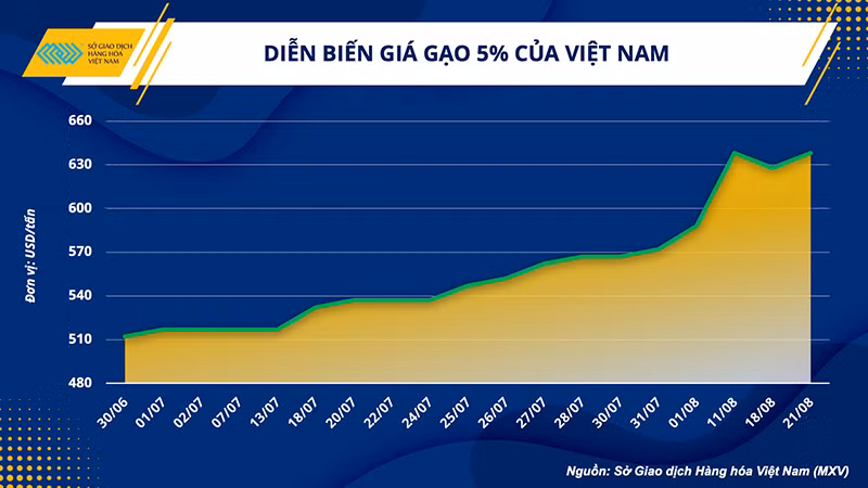 Theo Hiệp hội Lương thực Việt Nam, ngày 21/8, giá gạo xuất khẩu 5% tấm của nước ta đang ở mức 638 USD/tấn, cao hơn 10 USD so gạo Thái Lan cùng loại. Giá gạo 25% tấm của Việt Nam ở mức 623 USD/tấn, cao hơn nhiều so gạo cùng loại của Thái Lan là 563 USD/tấn.
