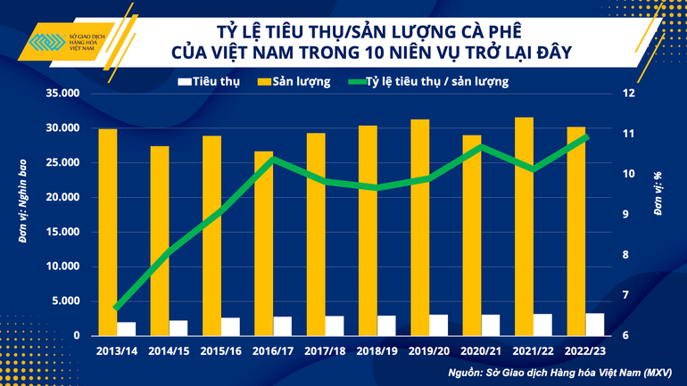 Không chỉ vậy, trung bình tỷ lệ tiêu thụ cà-phê trong nước chỉ đạt khoảng 10% trong 10 năm trở lại đây, thấp hơn rất nhiều so các nước xuất khẩu lớn như Brazil và Indonesia khi dao động từ 25-30% sản lượng cà-phê sản xuất ra. Điều này cho thấy không gian rộng lớn trong việc đẩy mạnh tiêu thụ cà-phê trong nước để góp phần phát triển ngành cà-phê của Việt Nam.