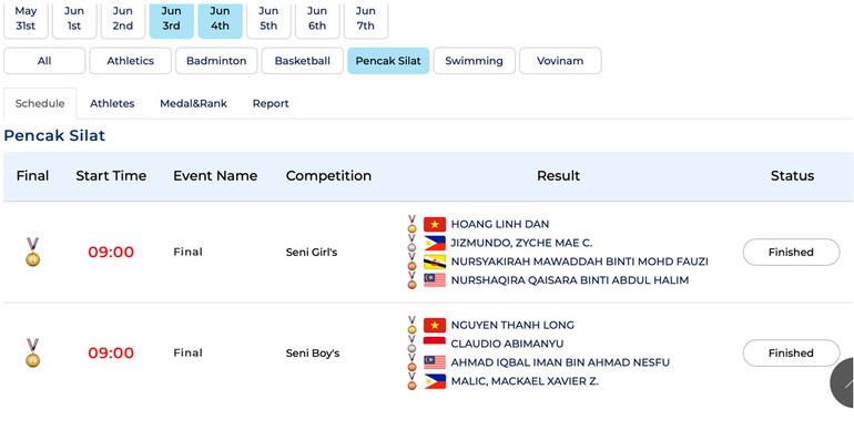 Môn Pencak Silat diễn ra từ ngày 3-6/6 với 16 nội dung; trong đó, nội dung đối kháng tanding nam, nữ với nhiều hạng cân; thi đấu senni biểu diễn nam và nữ... Trong ngày 3/6, các vận động viên sẽ thi đấu vòng loại đối kháng và biểu diễn.