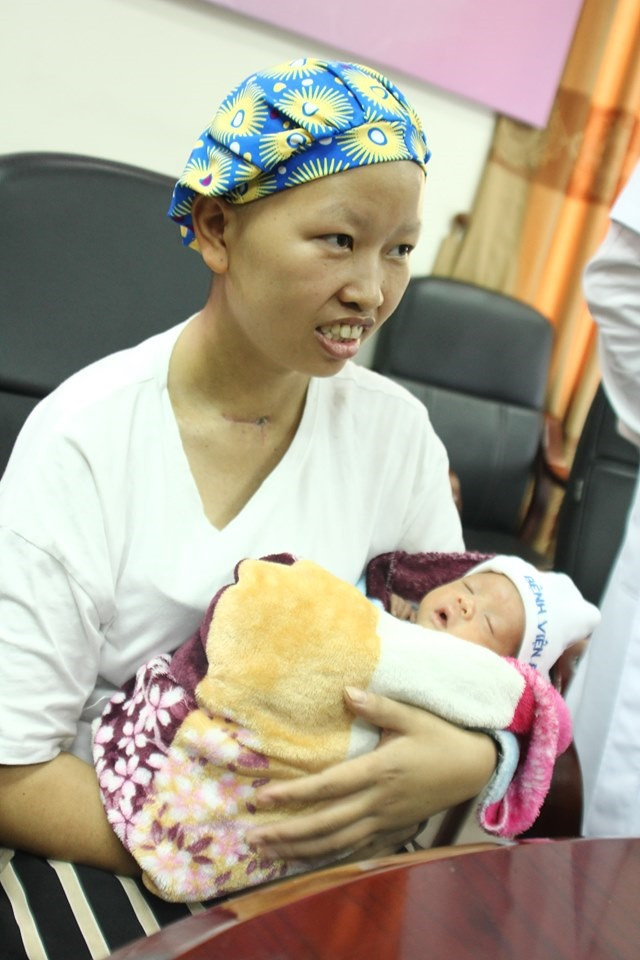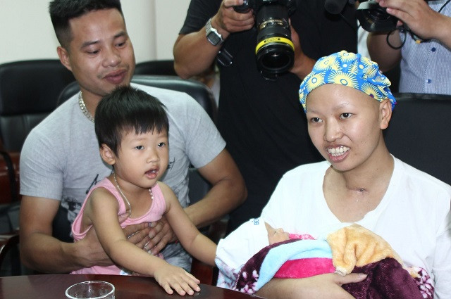 | Sản phụ Nguyễn Thị Liên (huyện Lý Nhân, Hà Nam) mang thai được bốn tháng thì được phát hiện bị ung thư vú giai đoạn cuối, đã di căn vào phổi, xương. Liên quyết định từ chối điều trị để nhường sự sống cho con và được các bác sĩ BV K Trung ương theo dõi sát sao. Đến ngày 22-5, khi thai được 31 tuần và sức khỏe của Liên tiến triển xấu, BV K Trung ương phối hợp với BV Phụ sản Trung ương thực hiện ca mổ đẻ trong tư thế sản phụ ngồi. Sau sinh, bé được chuyển về BV Phụ sản Trung ương chăm sóc đặc biệt. Liên tiếp tục được theo dõi, chăm sóc tại BV K Trung ương. Ngày 13-6, sản phụ Nguyễn Thị Liên lần đầu tiên được gặp con Đỗ Bình An khi bé vẫn đang phải nuôi trong lồng ấp. Hôm nay, 15-7 là lần thứ hai sản phụ Liên được gặp con và cùng đón con xuất viện về nhà. |