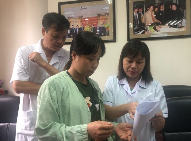 Chị Tâm (áo xanh) nghe lời dặn dò của các y, bác sĩ về cách chăm sóc Đỗ Bình An.
