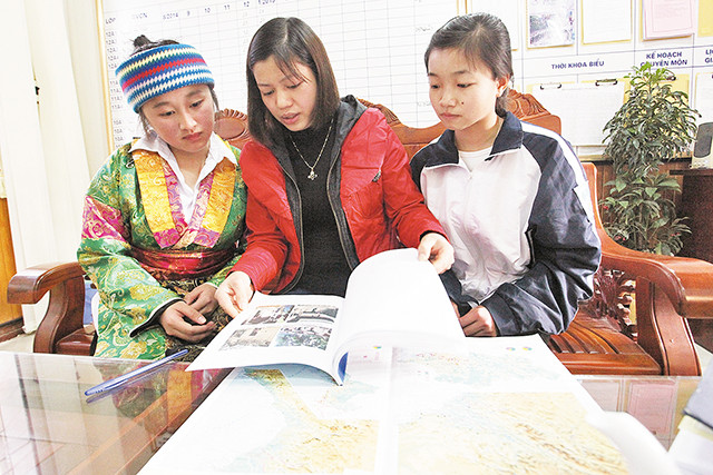 Hai em Vàng Thị Mai (trái), Hoàng Thị Bích (phải) xem lại đề tài phát huy giá trị tam giác mạch phục vụ du lịch.