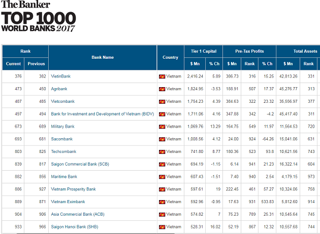Các ngân hàng Việt Nam trong Top 1.000 World Banks 2017 của The Banker (nguồn: www.thebankerdatabase.com).