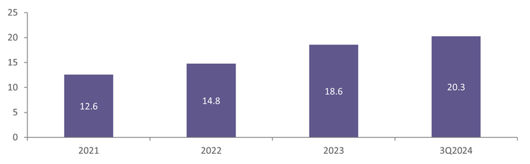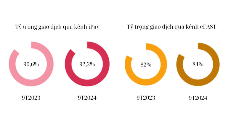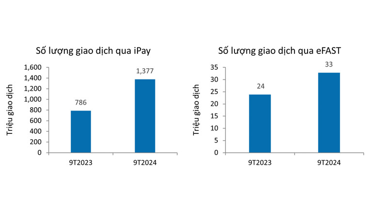 Nhờ những nỗ lực phát triển dịch vụ thanh toán số, số lượng giao dịch qua eFAST và iPay của VietinBank trong Quý III/2024 tăng lần lượt 37,6% và 75,2% so với cùng kỳ năm trước; tỷ trọng giao dịch qua iPAY của khách hàng cá nhân đạt 92,2% và qua kênh eFast của KHDN đạt 84%.