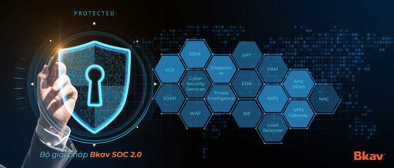 Bộ giải pháp tổng thể phòng chống hacker và virus mã hóa tống tiền Bkav SOC 2.0 được xây dựng nhằm bảo vệ toàn diện cho hệ thống mạng bao gồm máy chủ, máy tính cá nhân và ứng dụng web. Điều quan trọng, Bkav SOC 2.0 cho phép giám sát mọi hành vi trong hệ thống, bao gồm tất cả các máy tính trạm, máy chủ, các thiết bị mạng, các phần mềm, để phát hiện những bất thường như copy dữ liệu hàng loạt, mã hóa...