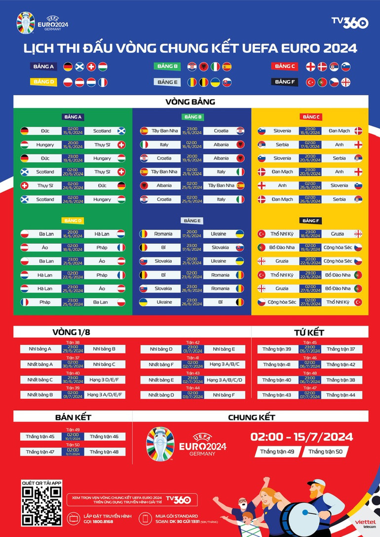 Để xem UEFA EURO 2024 trên TV360, khách hàng có thể lựa chọn đăng ký dịch vụ TV360 theo tháng với gần 200 kênh truyền hình trong nước và quốc tế, xem sớm nhất phim song song, độc quyền và các giải thể thao hàng đầu thế giới. Bên cạnh đó, Viettel Telecom triển khai ưu đãi “Xem Euro - Săn bóng vàng cùng TV360”. Tham gia chương trình, khách hàng sẽ có cơ hội nhận được 1 trong 3 giải thưởng, mỗi giải gồm 1 quả bóng vàng Euro 24K trị giá 1 cây vàng 9999.