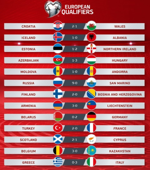 Kết quả ở một số bảng đấu khác, Đức dễ dàng vượt qua Belarus ở bảng C với hai bàn thắng của Leroy Sana và Marco Reus, trong khi đương kim á quân World Cup Croatia hạ Xứ Wales 2-1 ở bảng E. Tuyển Bỉ độc chiếm ngôi đầu bảng I với chín điểm tuyệt đối, sau chiến thắng 3-0 trên sân nhà trước Kazakhstan nhờ các bàn thắng của Dries Mertens, Timothy Castagne và Romelu Lukaku. Cũng ở bảng I, chiến thắng đậm nhất trong lượt trận sáng nay phải kể đến màn hủy diệt 9-0 của Nga trước San Marino, trong đó tiền đạo của Zenit St. Petersburg, Artem Dzyuba ghi tới bốn bàn thắng. Ở bảng J, Italia có chiến thắng thứ ba liên tiếp sau khi dễ dàng hạ Hy Lạp 3-0 dù phải đá sân khách sáng nay.