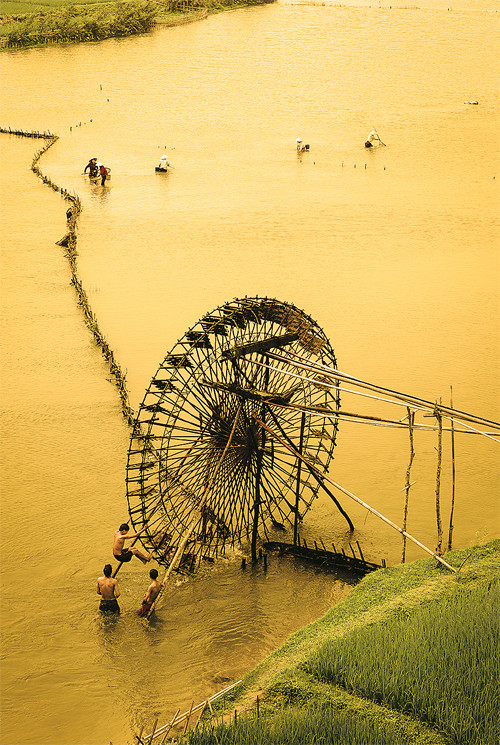 Bất giác, tôi như bị thôi miên bởi quy tắc hoạt động có vẻ giản đơn mà chứa đựng bao tìm tòi trở trăn và gửi gắm ước vọng đổi đời của cha ông trên bước đường chinh phục thiên nhiên và lao động sản xuất. Việc dẫn nước thật tài tình. Những ống bương được buộc nối bằng sợi dây mây với vành cọn, để cùng một vòng quay, ống bương chúc đầu xuống vốc từng "mẻ nước", nhấc lên, đổ vào chiếc máng cao chờ sẵn. Từ chiếc máng đó, nước dẫn vào chiếc máng đặt thấp hơn, đưa về đồng. Có khi nước được dẫn về tận bên hiên nhà sàn, để phục vụ cho sinh hoạt của cả gia đình, lối xóm.