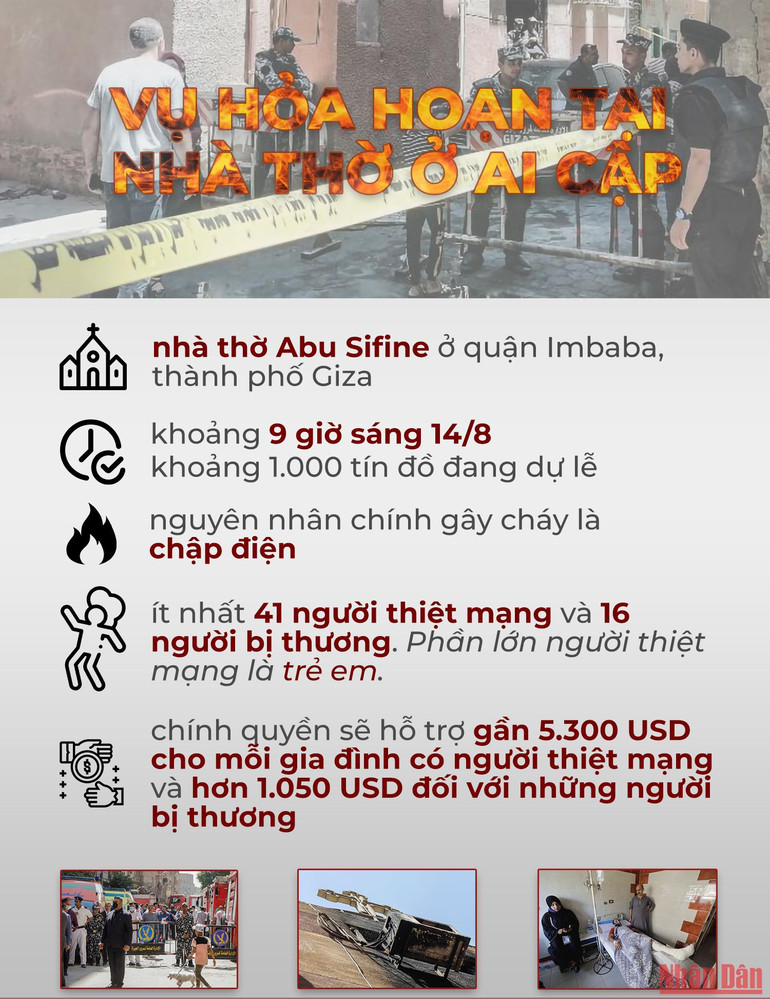 Theo kết quả điều tra sơ bộ, sự cố chập điện là nguyên nhân chính dẫn tới vụ hỏa hoạn tại một nhà thờ ở Ai Cập khiến 41 người thiệt mạng và 16 người bị thương.