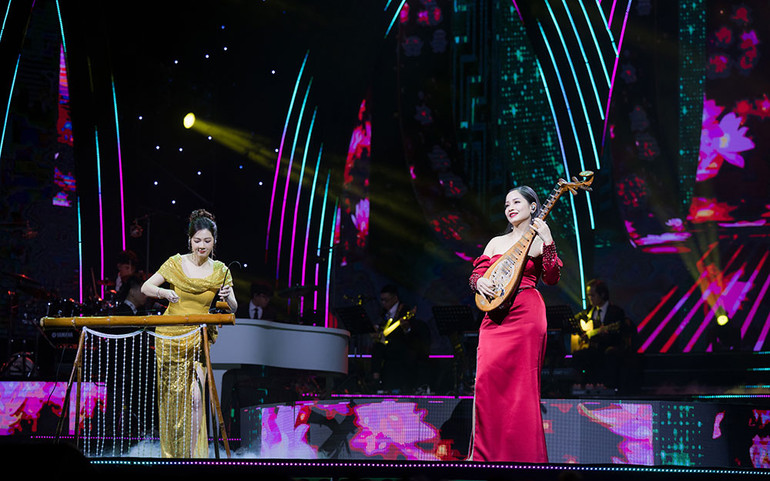 Hai nghệ sĩ Diệu Thảo và Lệ Giang thăng hoa với nhạc cụ dân tộc.
