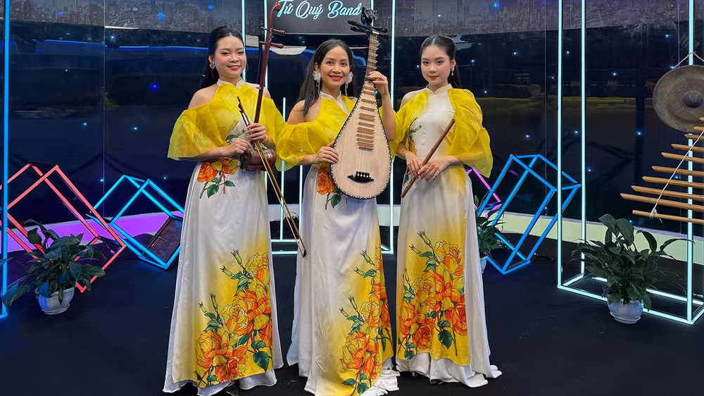 Nghệ sĩ Diệu Thảo (hàng trên, ở giữa) trình diễn cùng các nghệ sĩ nhạc cụ dân tộc khác.