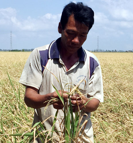 Anh Trương Văn Quý, ấp Vĩnh Tây 1, xã Vĩnh Phong, huyện Vĩnh Thuận có 5 công ruộng (thuê) bị thiệt hại do hạn mặn, phải bồng bế cả gia đình đi làm thuê.