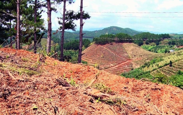 NDĐT - Trên những quả đồi nằm sát cung đường ô-tô đến tận nơi, thuộc tiểu khu 261b, địa bàn xã Nam Hà, huyện Lâm Hà, tỉnh Lâm Đồng (người dân thường gọi khu vực “núi lửa”), hàng loạt cây thông ba lá hơn 20 năm tuổi bị triệt hạ nằm ngổn ngang. Gần đó là những khu vườn sản xuất của người dân.