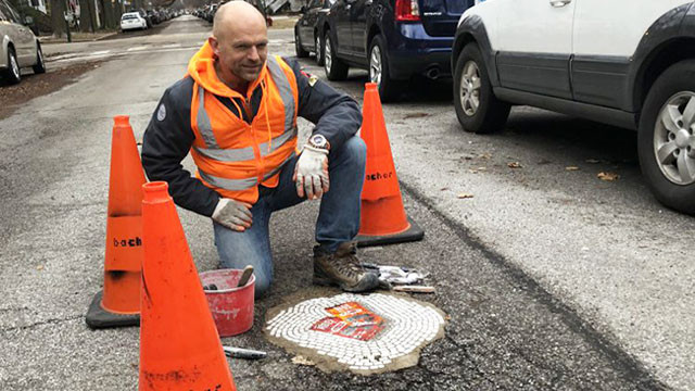 Anh Jim Bachor sống tại TP Chicago (Mỹ) là nghệ sĩ đường phố hiếm hoi sáng tạo ra những bức tranh khảm trên các ổ gà đường nhựa (trong ảnh). Từ tháng 5-2013, Bachor bắt đầu dùng đá cẩm thạch và thủy tinh nhiều mầu sắc tạo thành các tác phẩm tranh khảm trên ổ gà. Ý tưởng độc đáo này hình thành sau khi anh thăm di tích cổ Pompeii (Italia), nơi nổi tiếng với những bức tranh khảm.