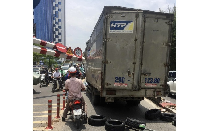 Theo lực lượng chức năng cho biết, ngay sau khi đâm đổ thanh giới hạn chiều cao cầu vượt, tài xế xe tải đã rời khỏi hiện trường. Được biết, giới hạn chiều cao của cầu vượt Thái Hà - Chùa Bộc là 2,2 m, xe có trọng tải lớn không được phép lên cầu.